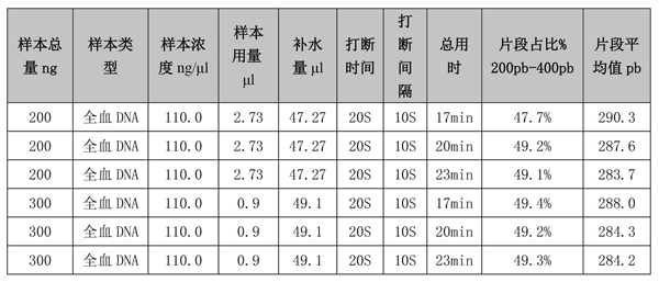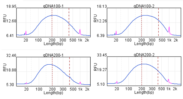 在投入量分別是200ng時,通過Qsep100片段分析儀檢測,打斷的DNA片段在200-400bp區間占比分別是 47.7%、49.2%、49.1%;片段平均值分別是290.3bp、287.6bp、283.7bp, 在投入量分別是300ng時,通過Qsep100片段分析儀檢測,打斷的DNA片段在200-400bp區間占比分別是 49.4%、49.2%、49.3%;片段平均值分別是288.0bp、284.3bp、284.2bp, 說明該儀器打斷效果不錯,打斷片段峰形為單一峰形,較完整。
