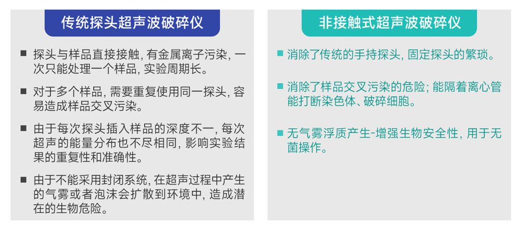 采用超聲波磁致伸縮的原理,把超聲波波形聚焦在液體中,使超聲波能量有質的轉變。傳統的探頭超聲波破碎儀,探頭與樣品直接接觸,一次只能處理一個樣品,實驗周期長;對于多個樣品,需要重復使用同一探頭,容易造成樣品交叉污染。由于每次探頭插入樣品的深度不同,每次超聲的能量分布也不盡相同,影響實驗結果的重復性和準確性。此外,由于不能采用封閉系統,在超聲過程中產生的氣霧或者泡沫會擴散到環境中,造成潛在的生物危險。